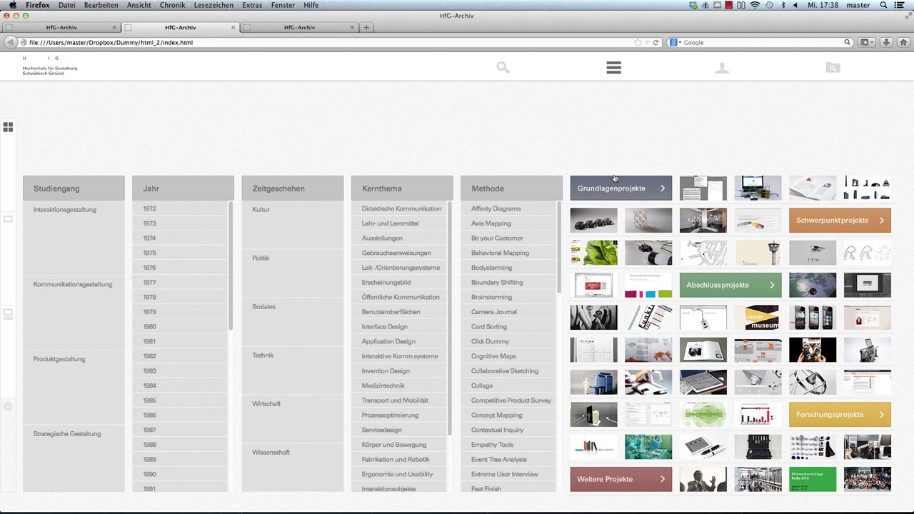 Basic and intermediate projects, and even theses and research projects are essential parts of the online archive. The application is divided into two axes for better orientation. Along the horizontal line the user gets an overview of various projects. On the vertical axis he approaches content step by step. In addition, the application provides a context layer on which the user can deduce background information. Information about sociopolitical and creative topics frames the conclusion of the projects. Each user has the possibility to collect a variety of projects in an individual folder that can be shared with other students.